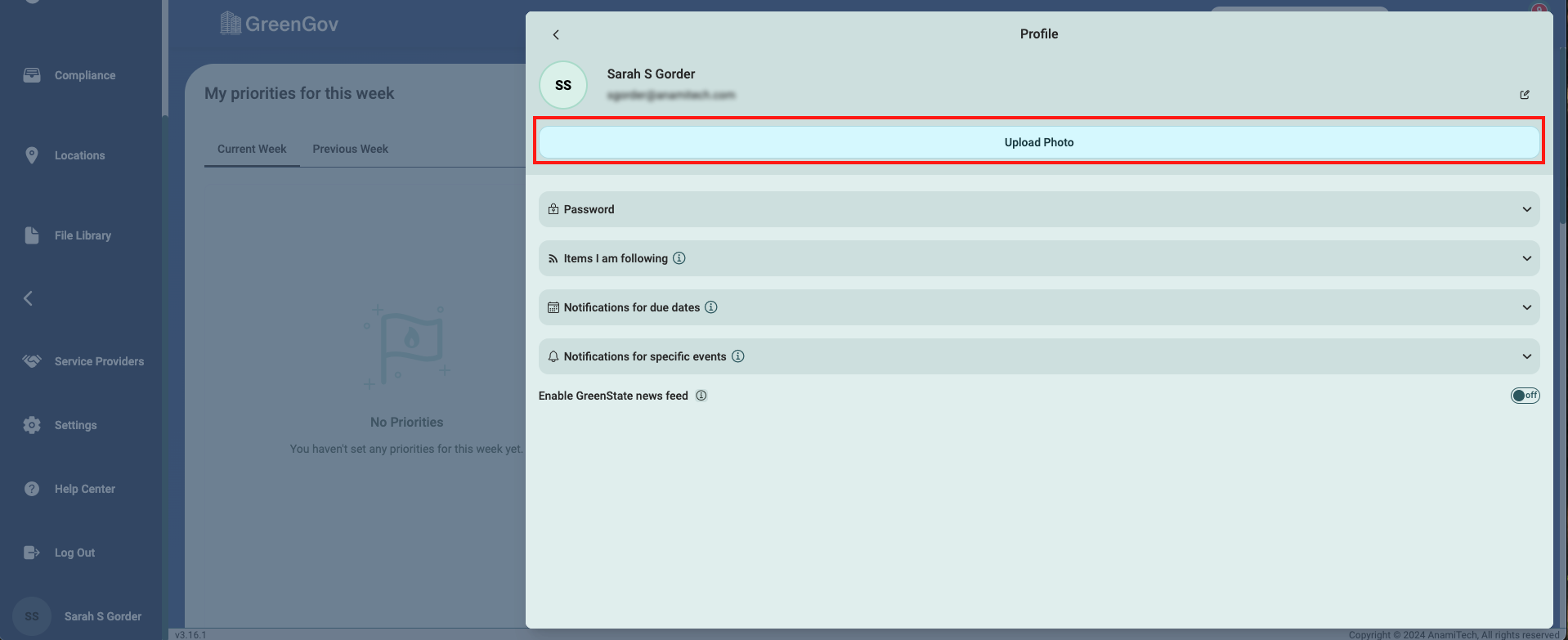 Click the "Upload Photo" option and select an image from your device. While avatars can be a fun way to express yourself, consider using a professional photo, especially if GreenGov is used for work-related projects. Choose a photo where your face is clearly visible. This helps team members easily identify you in discussions, tasks, and project updates. Consider using a consistent avatar across any other tools within your company for a unified online presence. Any cropping or editing will need to be done prior to uploading your photo.