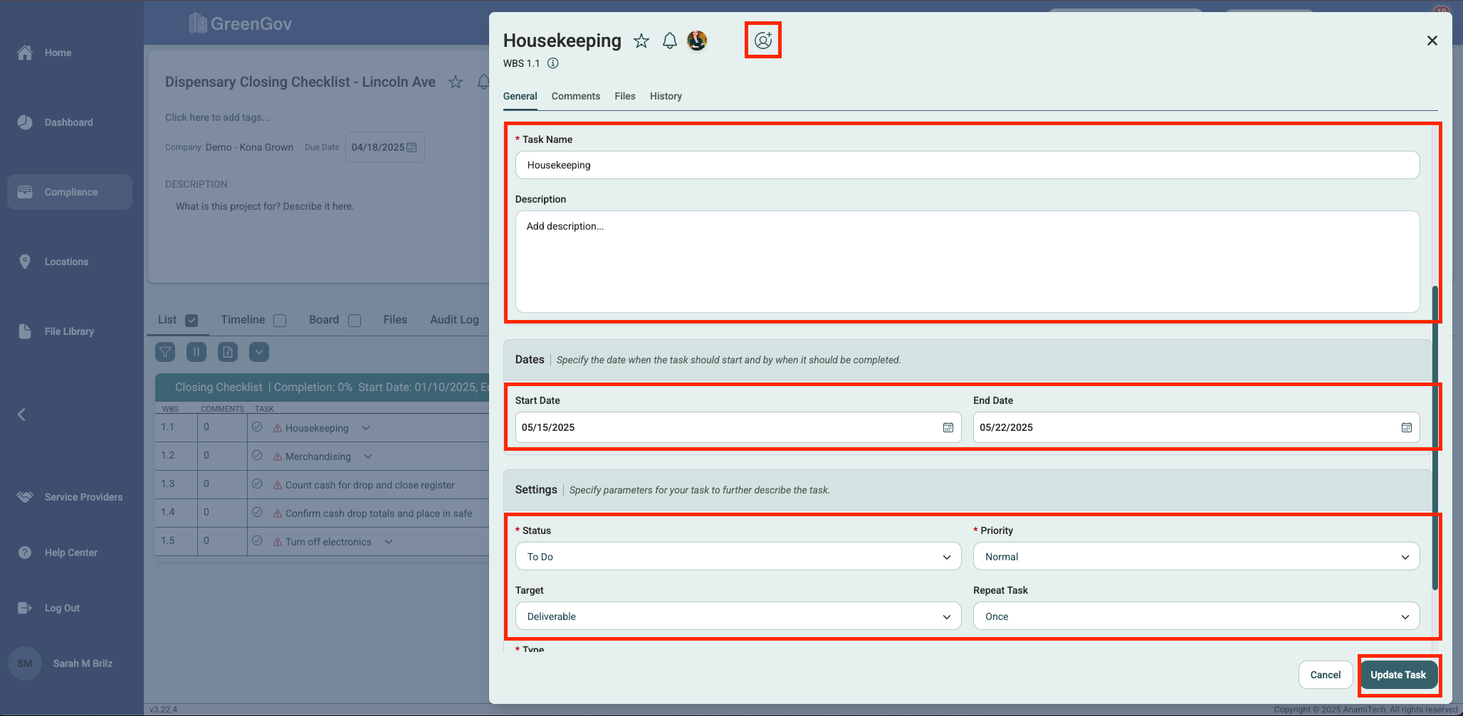 Modify any task details you need to change. You can assign team members, change the name, revise the description, manage sub-tasks, leave comments, attach files, and review the audit log.