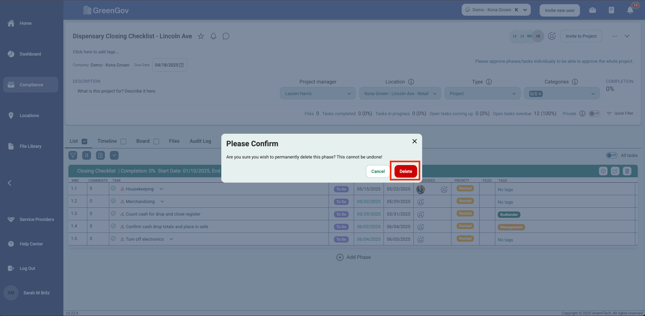 A confirmation pop-up will appear to ensure you would like to proceed, as this action cannot be undone. Click "Delete" to remove the phase from the project.