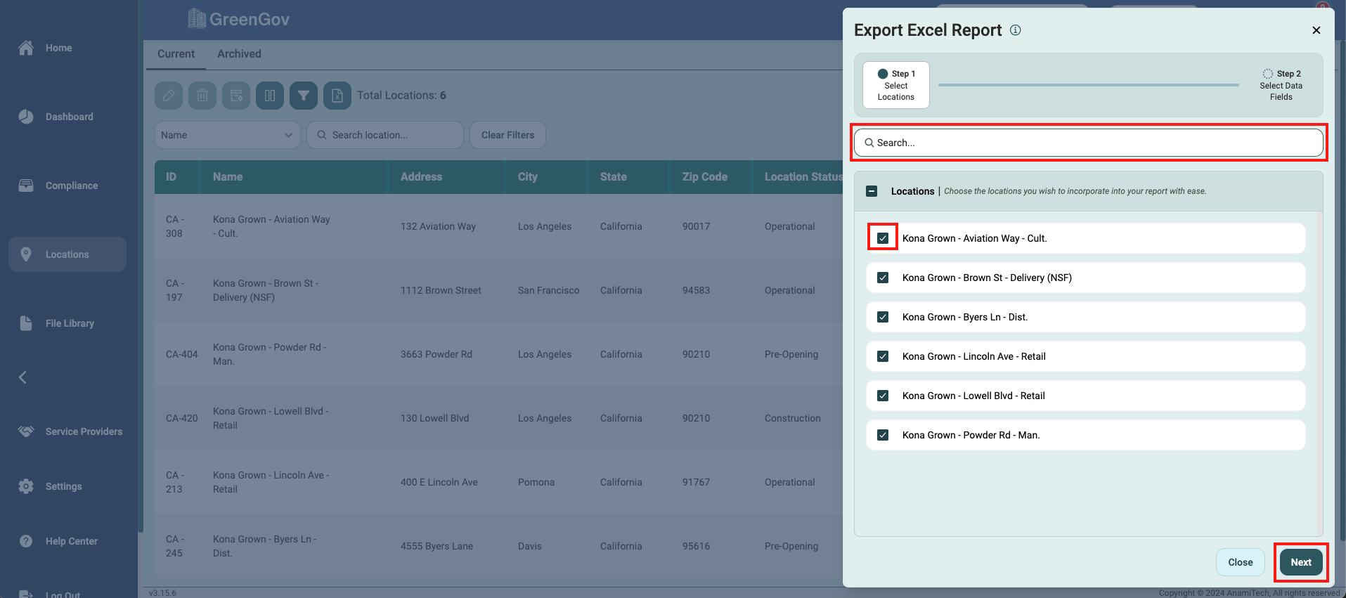 By default, the generator includes all locations. To customize, simply uncheck the box next to the location name to exclude it from the report. You can utilize the search bar to easily find specific locations. Once you are done selecting Locations, click "Next".