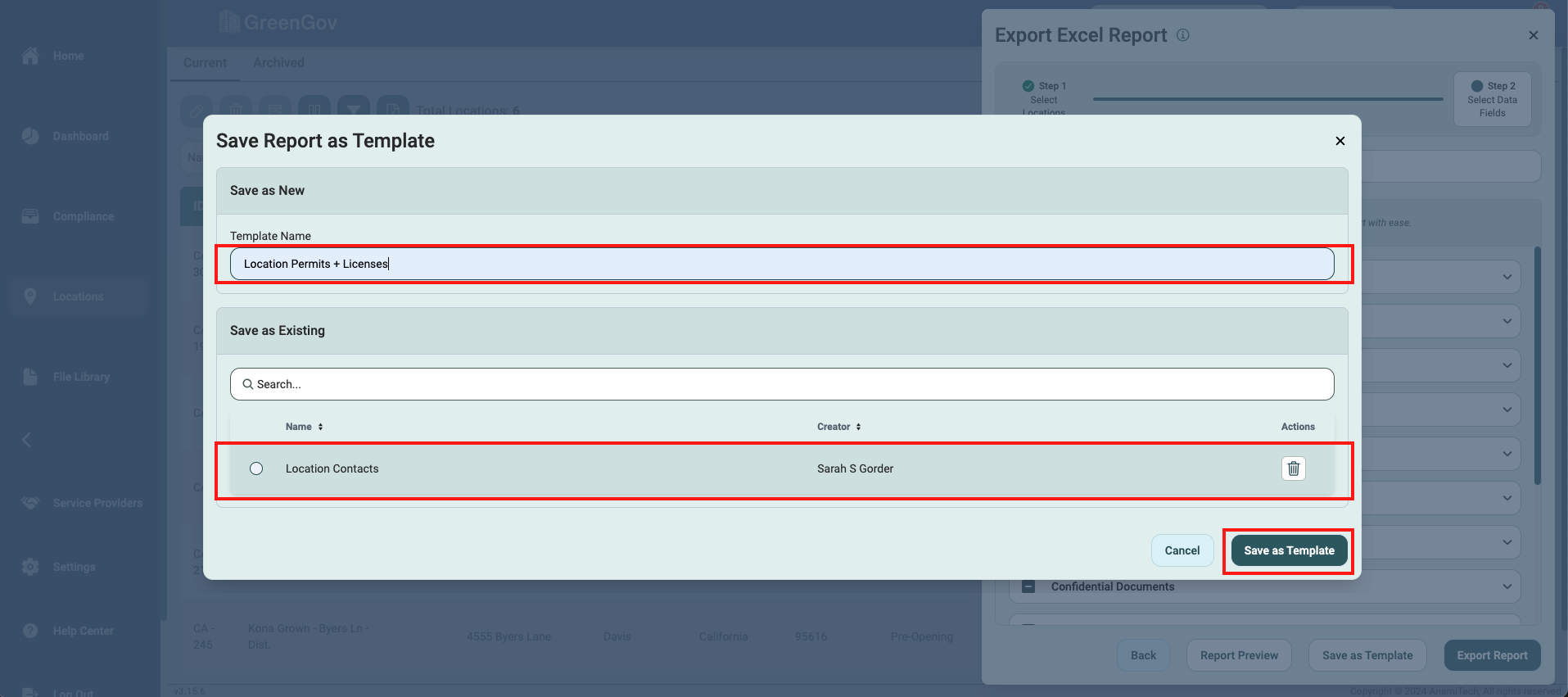 Name the template or select an existing one. Click "Save as Template" to confirm.