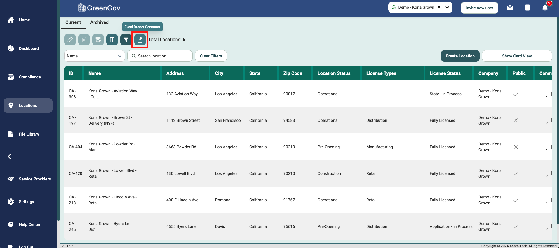 Click on the "Excel Report Generator" button positioned at the top of the Location List View.