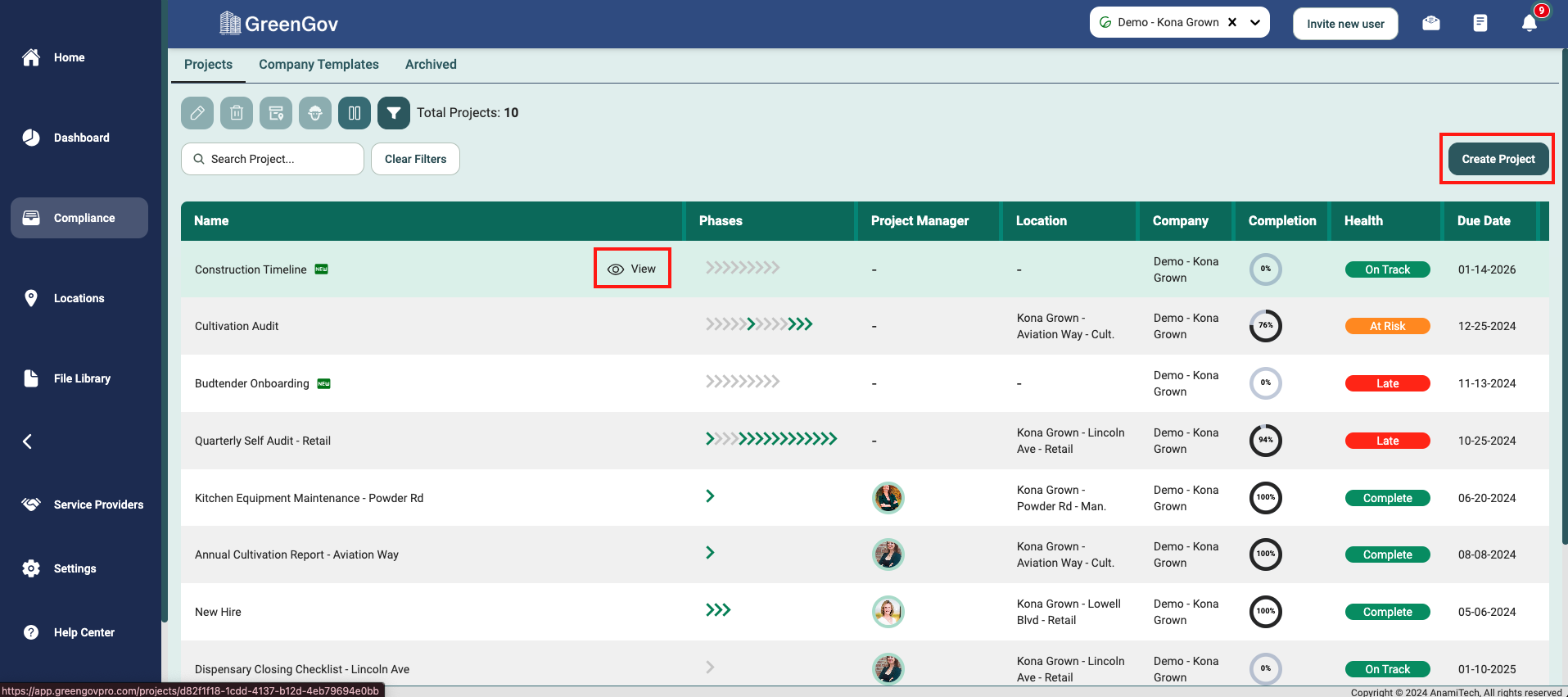 Create a new project from scratch by clicking "Create Project" or if you have an existing project, open it from the Project Overview page by hovering over the project and clicking the "view" eye icon.
