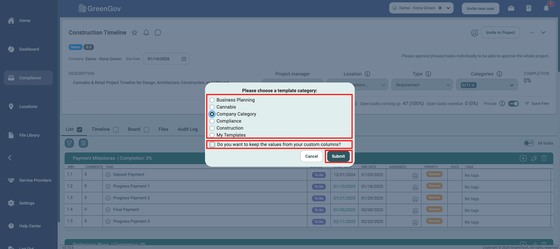 A pop-up box will appear with multiple template categories. Choose the desired category, decide if you would like to keep the values from your custom columns, then click "Submit" to save your template.