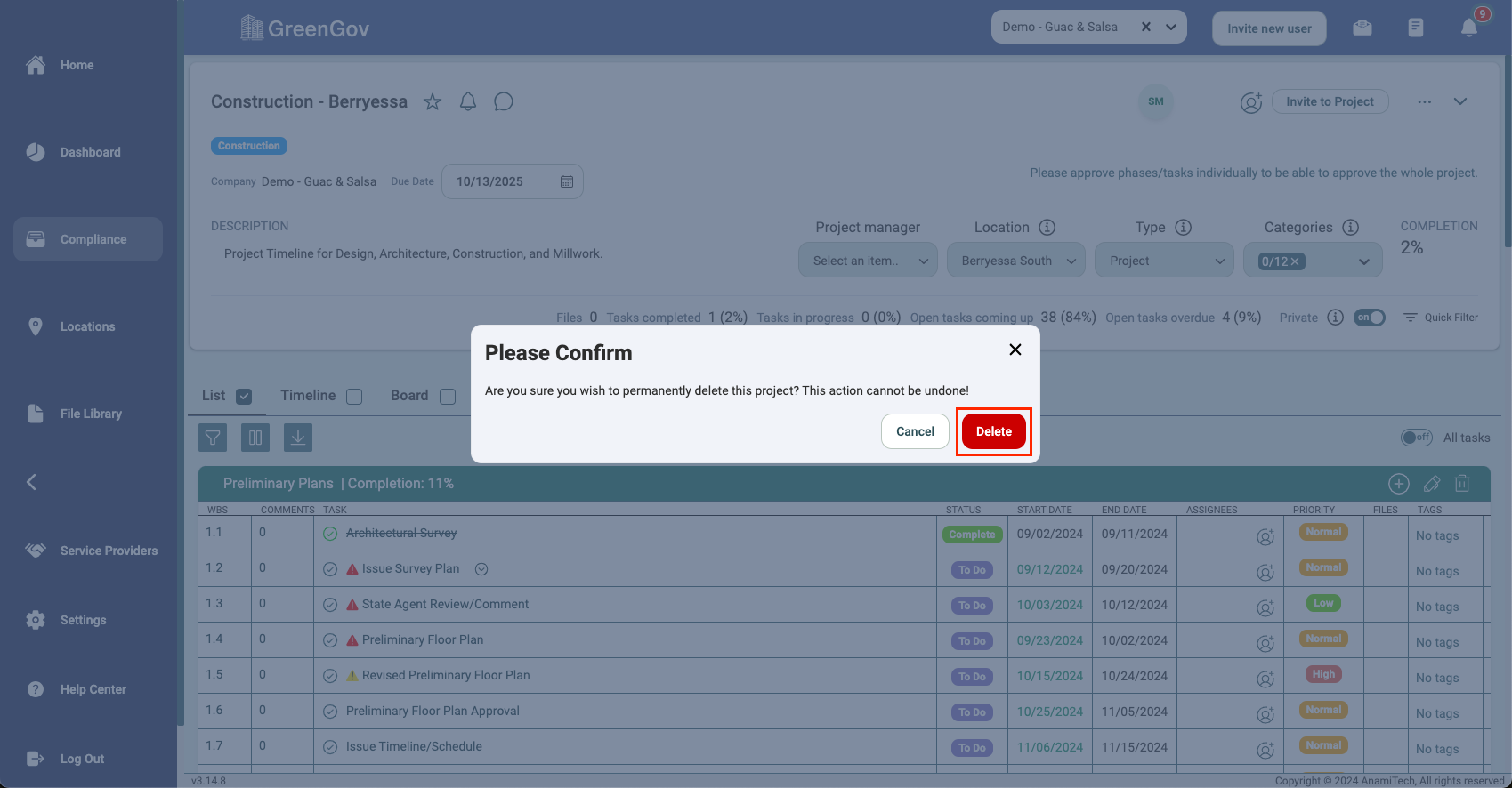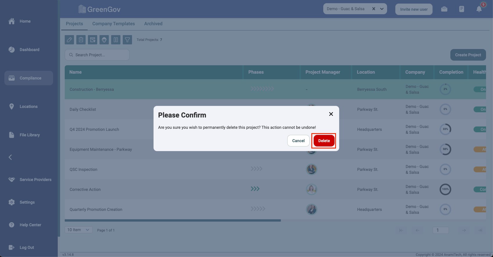 A confirmation window will appear, asking you to confirm your decision to delete the project. This step is important to prevent accidental deletions. Review the confirmation dialog carefully and consider any potential data loss or consequences associated with the deletion. If you are sure you want to proceed with the deletion, click the "Delete" button within the confirmation dialog. This final step will permanently remove the project from your company in GreenGov.