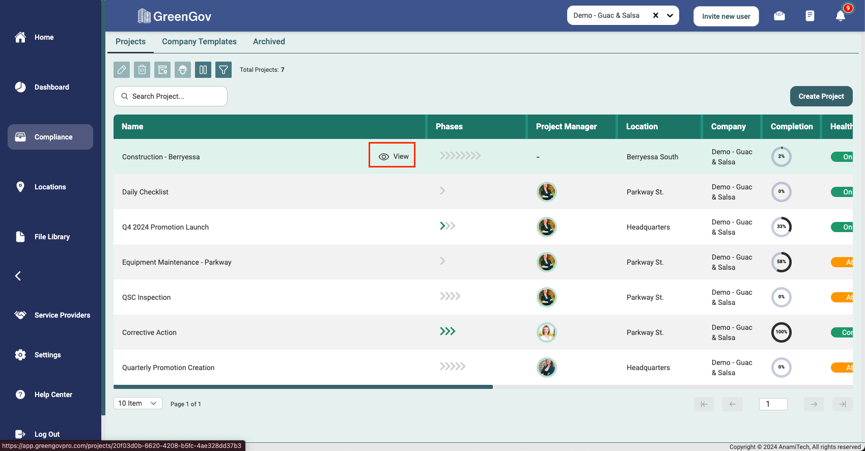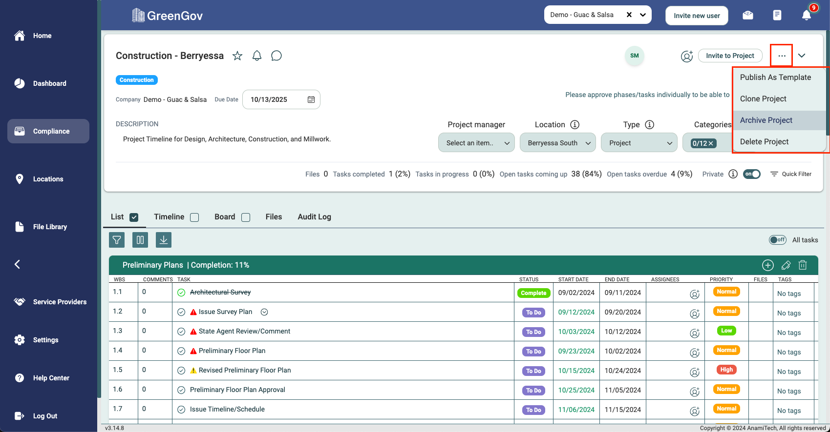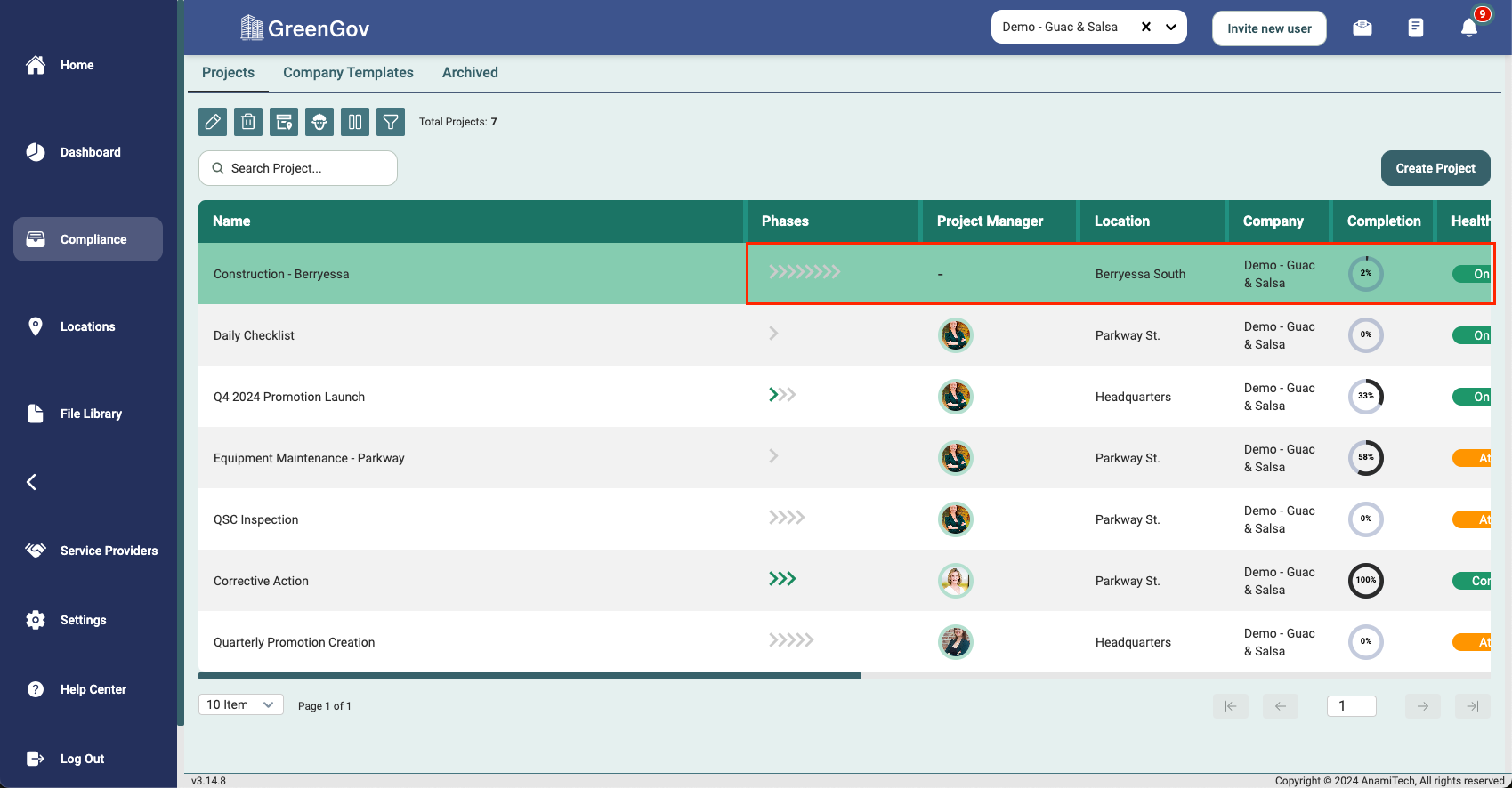 Once a project is deleted, it may not be recoverable. Exercise caution when deleting content from your company in GreenGov.
