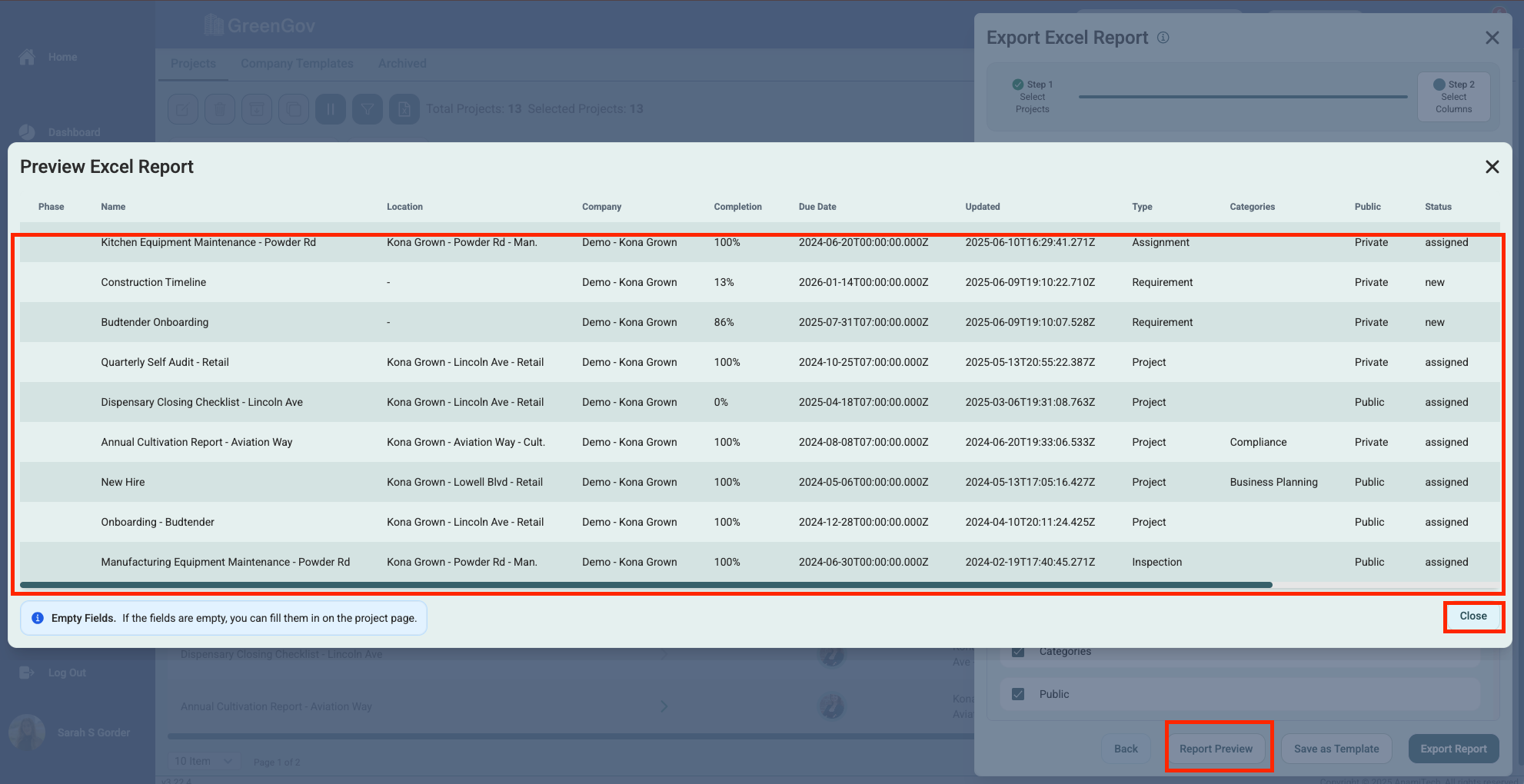 Click "Report Preview" to review the file before exporting to make sure everything appears as expected. Click "Close" when you are done.