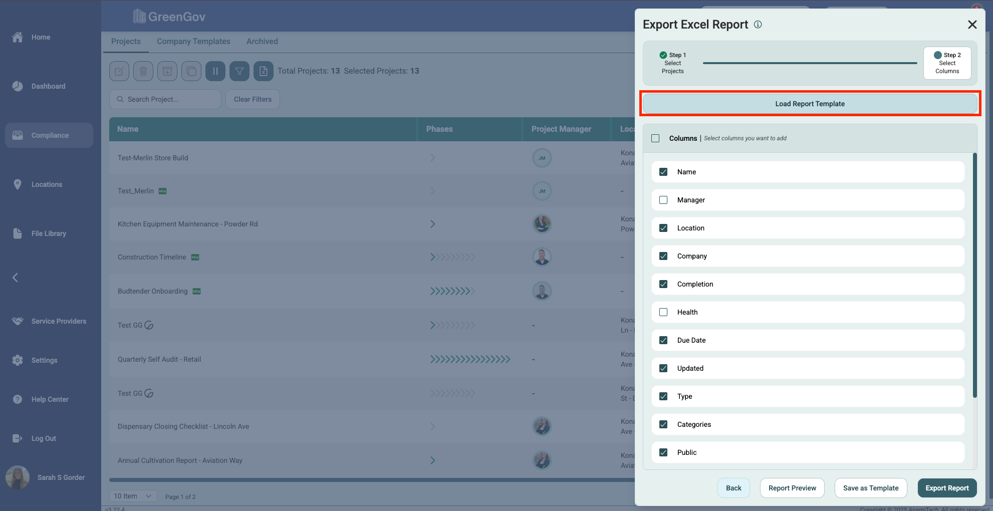 Click "Load Report Template" at the top of the Export To Excel pop-up window.
