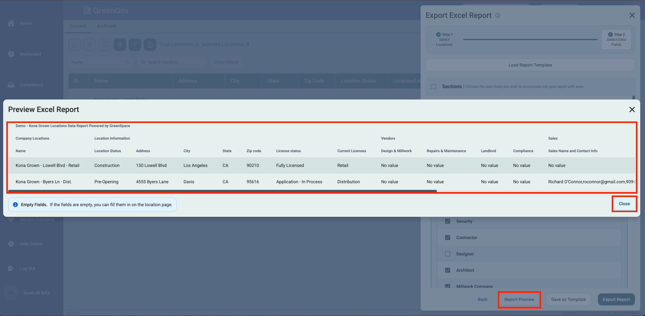 Click "Report Preview" to review the file before exporting to make sure everything appears as expected. Click "Close" when you are done.