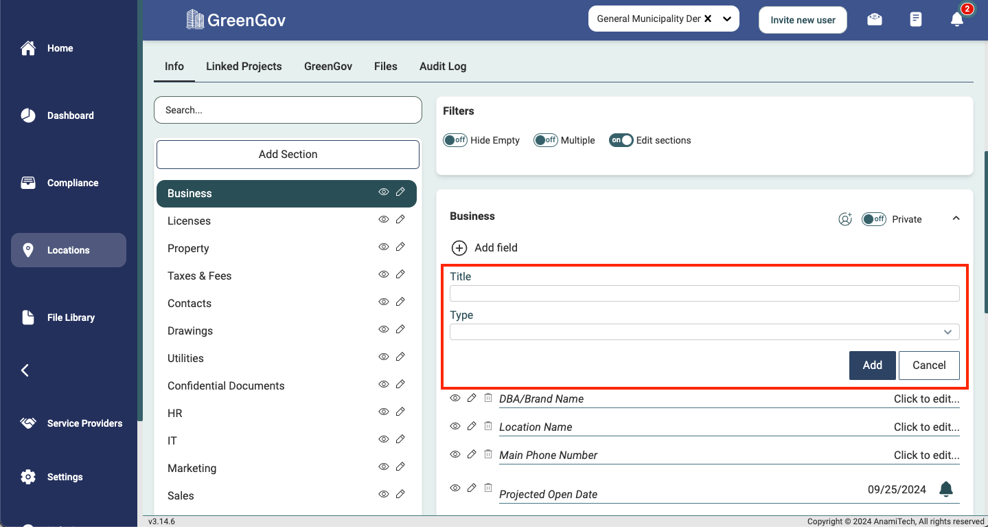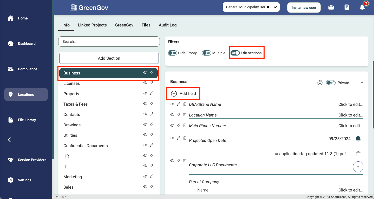 Toggle “Edit sections” to edit the sections and fields. Select the desired section you would like to add the date field and click "Add Field".
