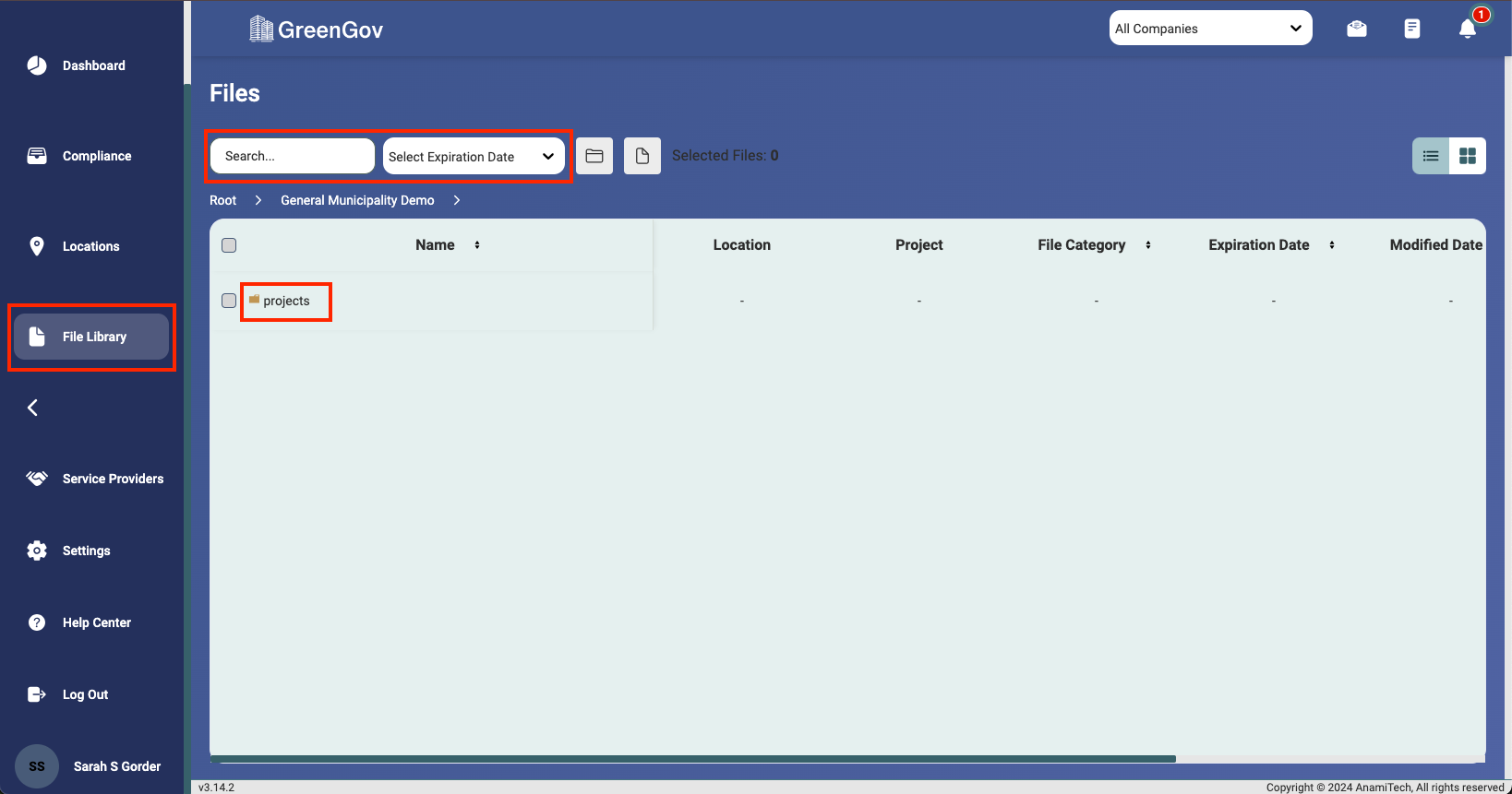 Click on the File Library option within the main menu to access all your stored files across your company. Locate your file by clicking through the files, typing the name in the search bar, or utilizing the category filter.