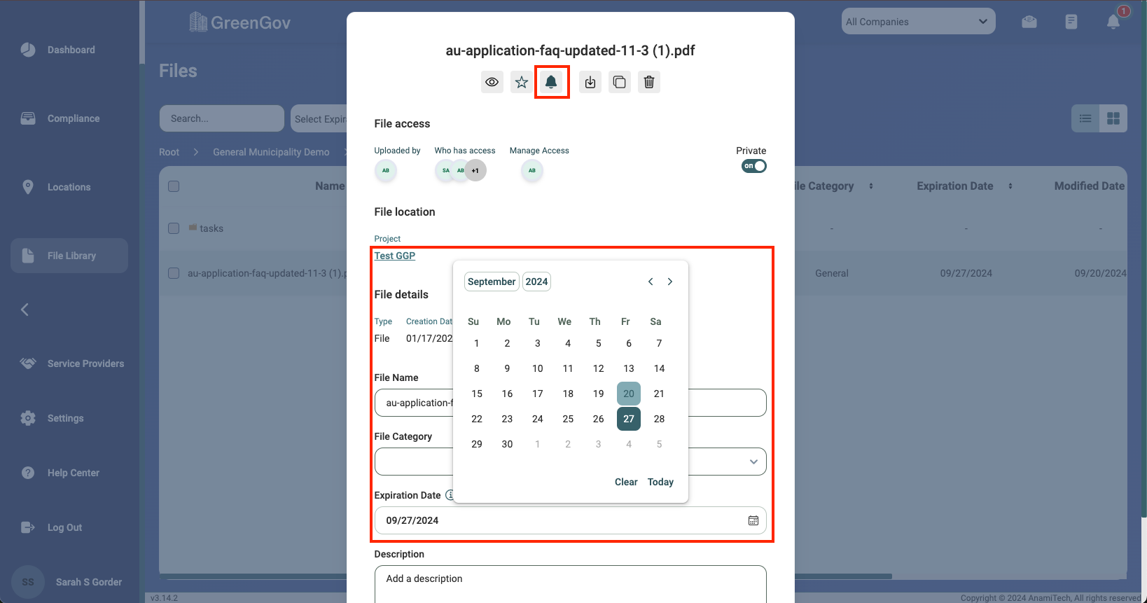 Click the file to expand the details and enter the expiration date. Ensure you receive notifications about the file expiration by selecting the subscribe bell button at the top of the window. You can adjust your notification preferences within your user profile.