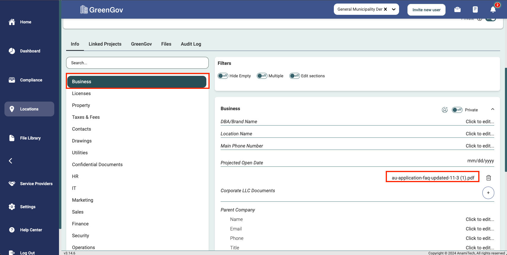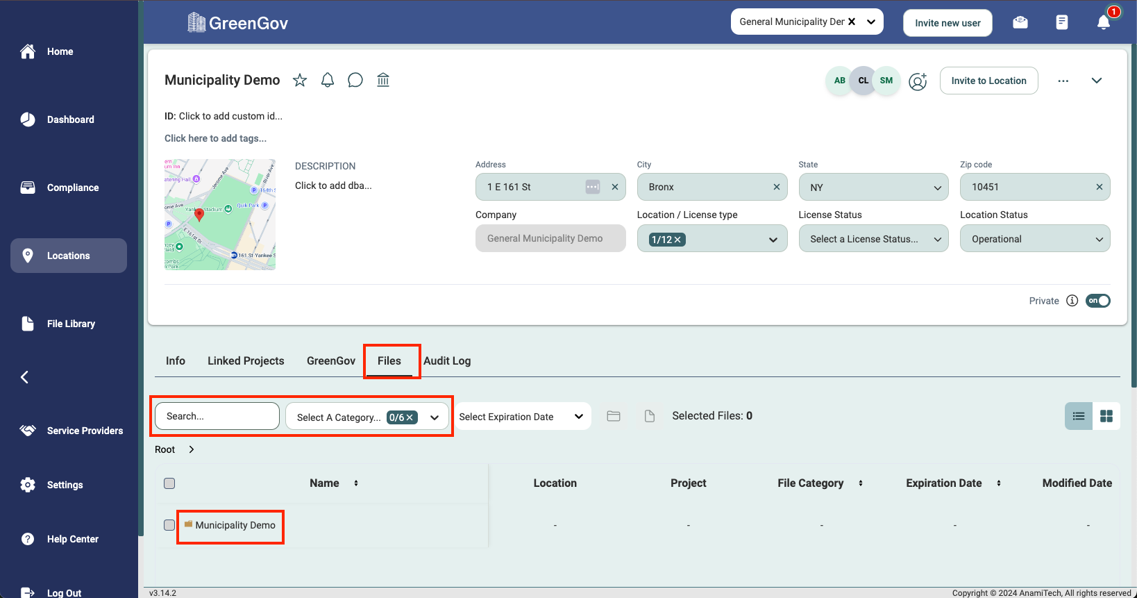 Click the File Tab to access all files associated with the desired Location. Locate your file by clicking through the files, typing the name in the search bar, or utilizing the category filter.
