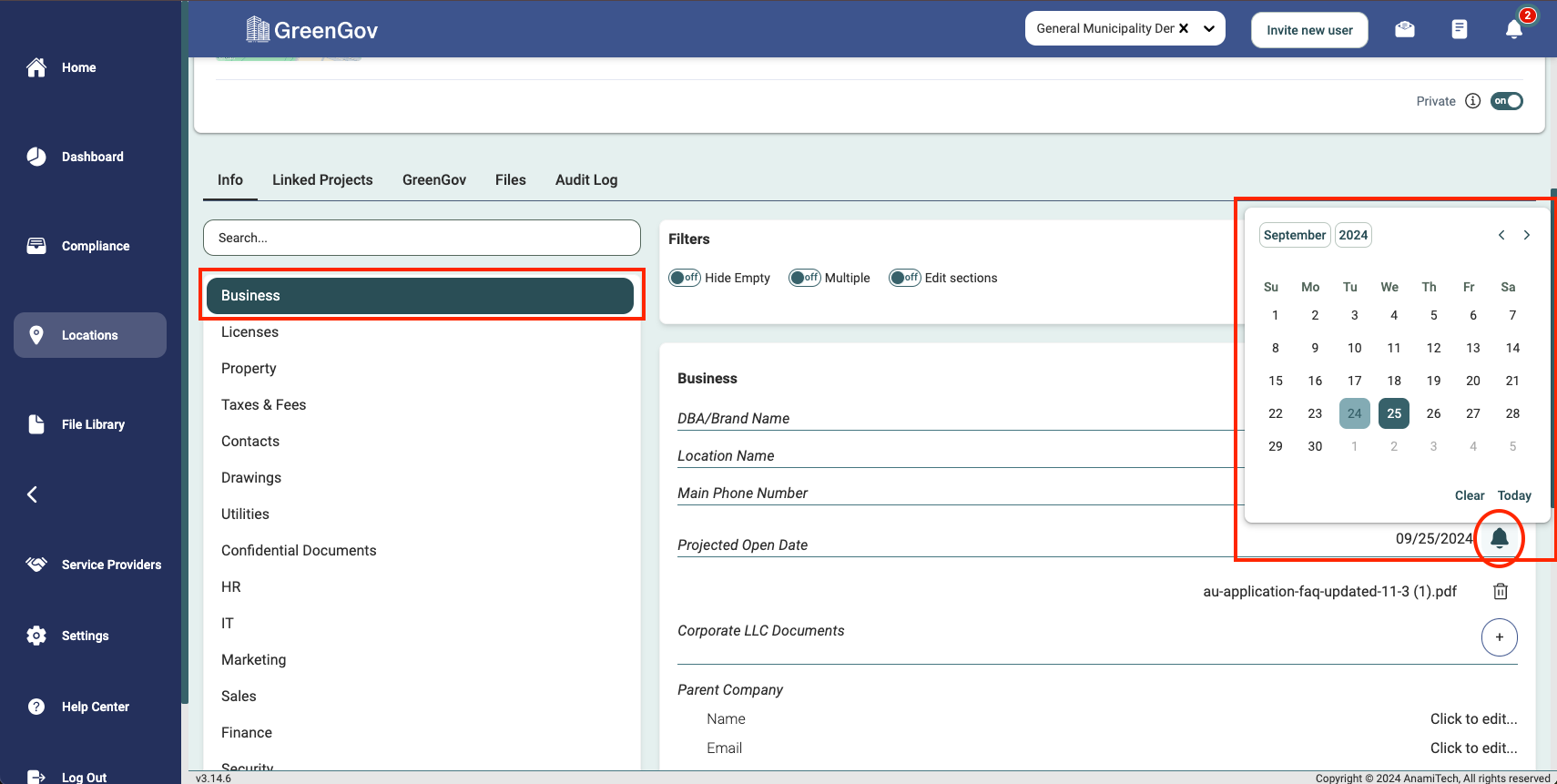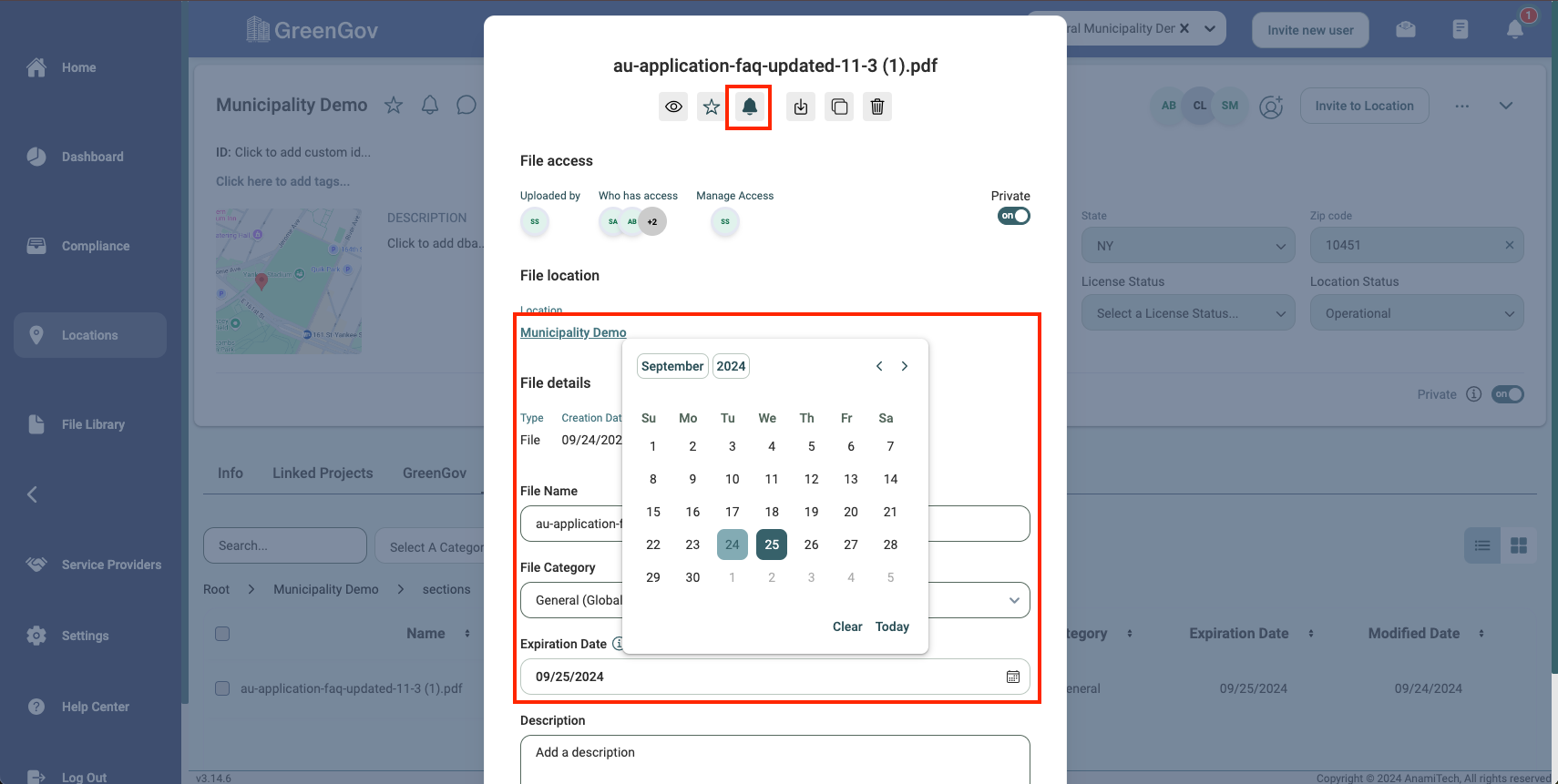 You will be redirected to the files tab within the location. Click the file to expand the details and enter the expiration date. Ensure you receive notifications about the file expiration by selecting the subscribe bell button at the top of the window. You can adjust your notification preferences within your user profile.
