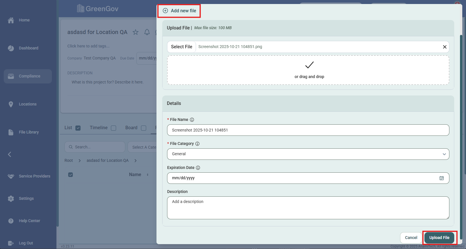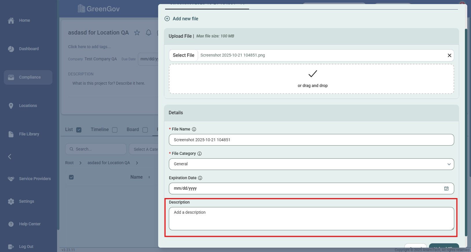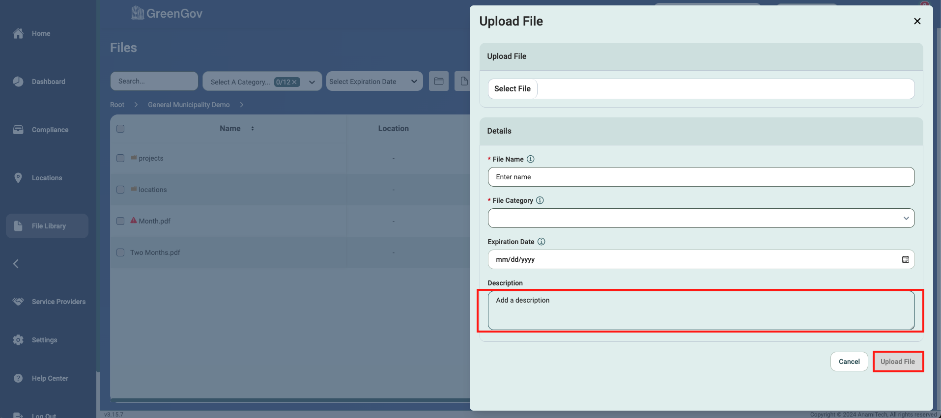 Fill out the description, if applicable, and click "Upload File" to save the file.