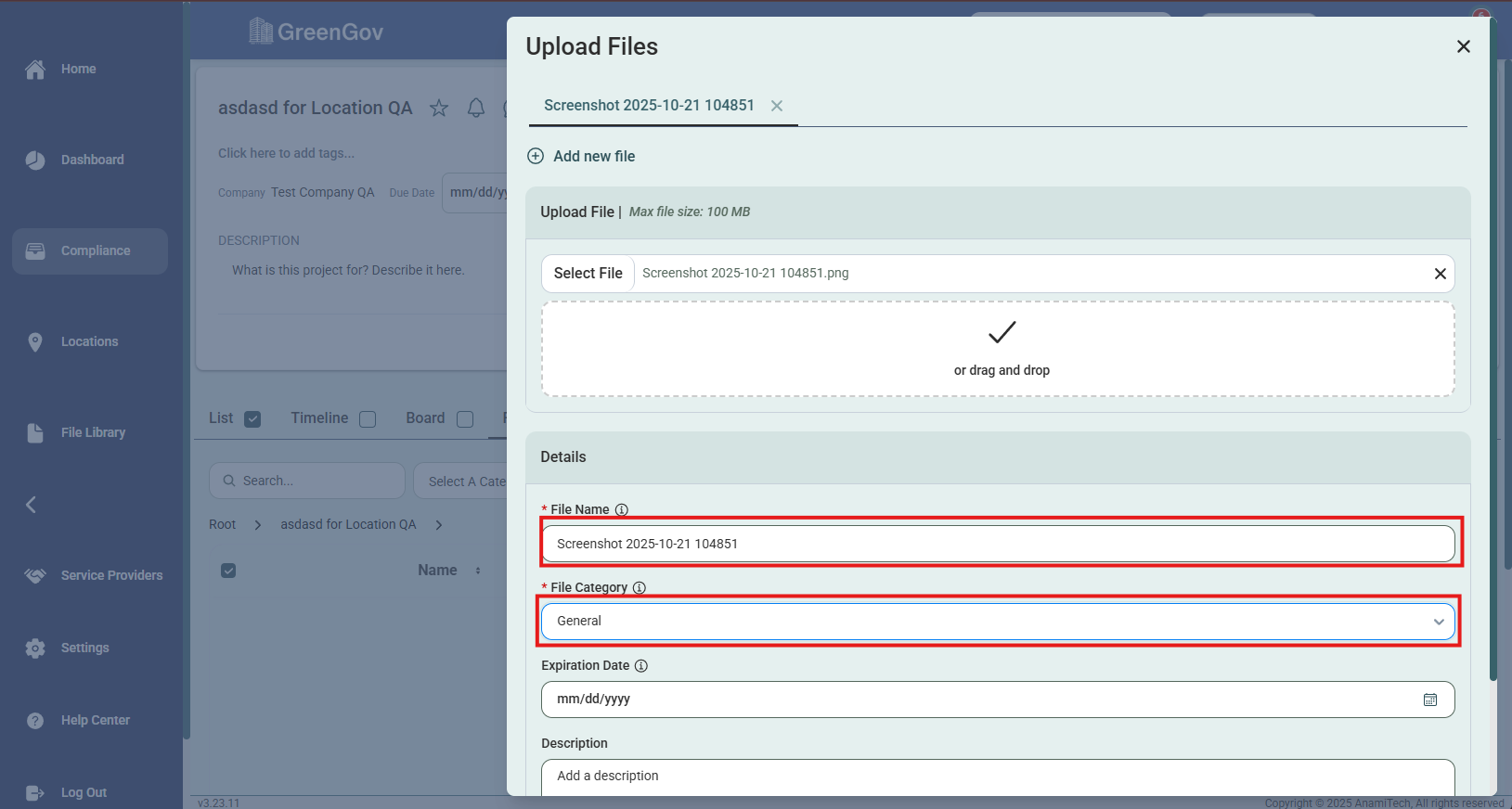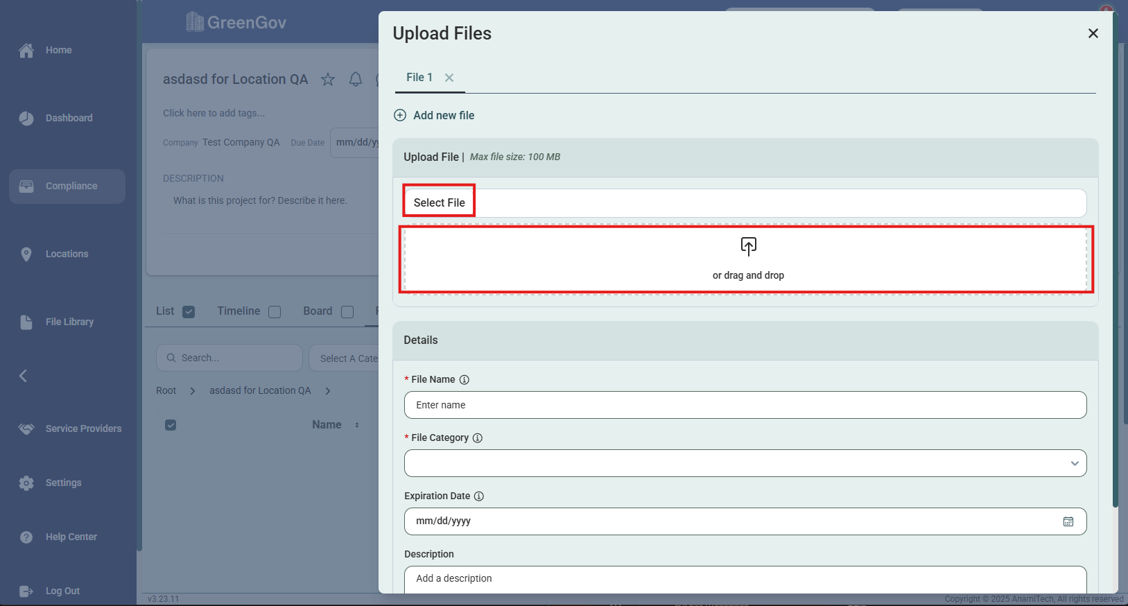 A pop-up window will appear. Click the "Select File" button to upload a file from your device or drag and drop into the designated area. The max file size you can upload is 100 MB.
