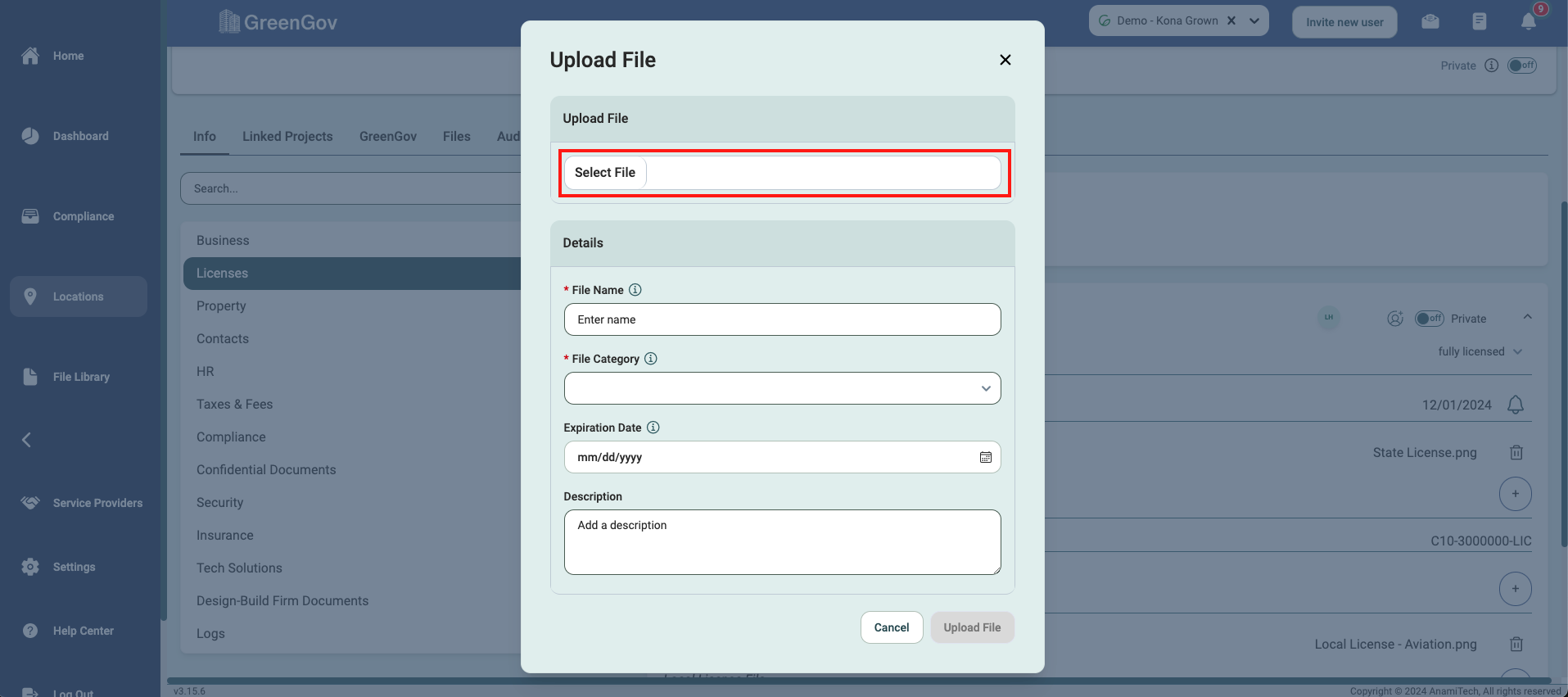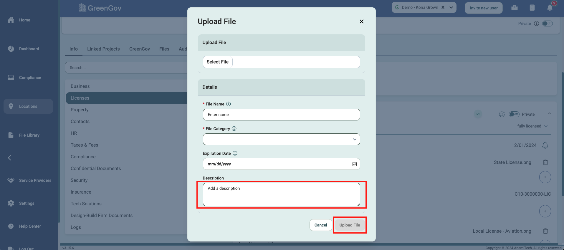 Fill out the description, if applicable, and click "Upload File" to save the license to the desired Location.
